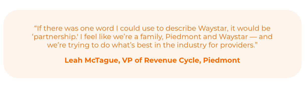 “If there was one word I could use to describe Waystar, it would be ‘partnership,’” says Leah McTague, VP of Revenue Cycle at Piedmont. “I feel like we’re a family, Piedmont and Waystar — and we’re trying to do what’s best in the industry for providers.”